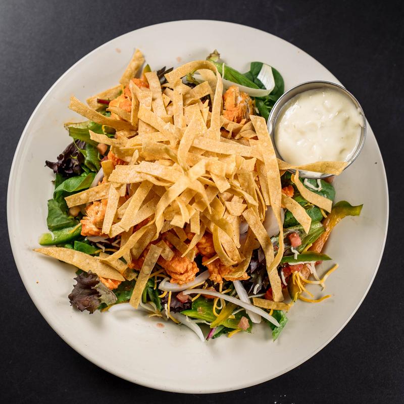 Iceberg lettuce, tomatoes, onions, peppers, shredded cheese, tortilla straws & fried buffalo chicken served with blue cheese dressing