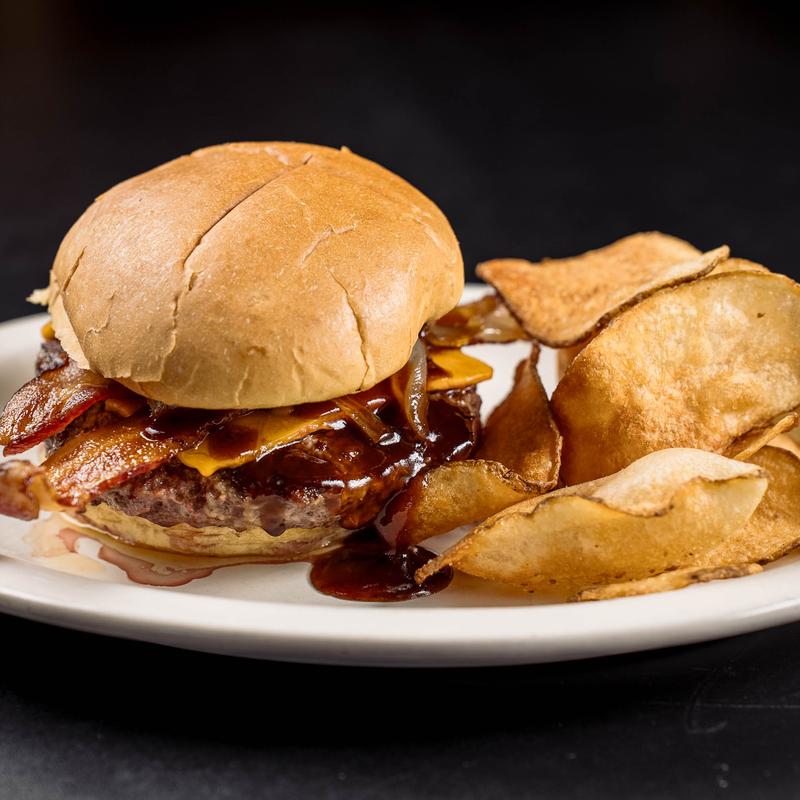 Angus burger with cheddar cheese, BBQ sauce, fried onions and bacon