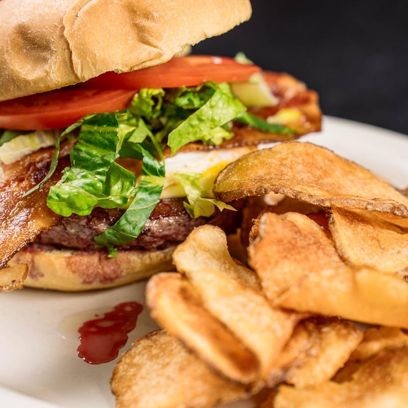 Angus burger with American cheese, bacon, fried egg, lettuce, tomato and mayo