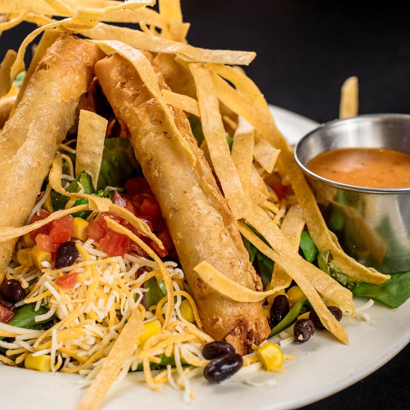 Iceberg lettuce, tomatoes, shredded cheese, corn, black beans topped with crisp fried chicken taquitos and tortilla straws. served with sweet chipolte dressing